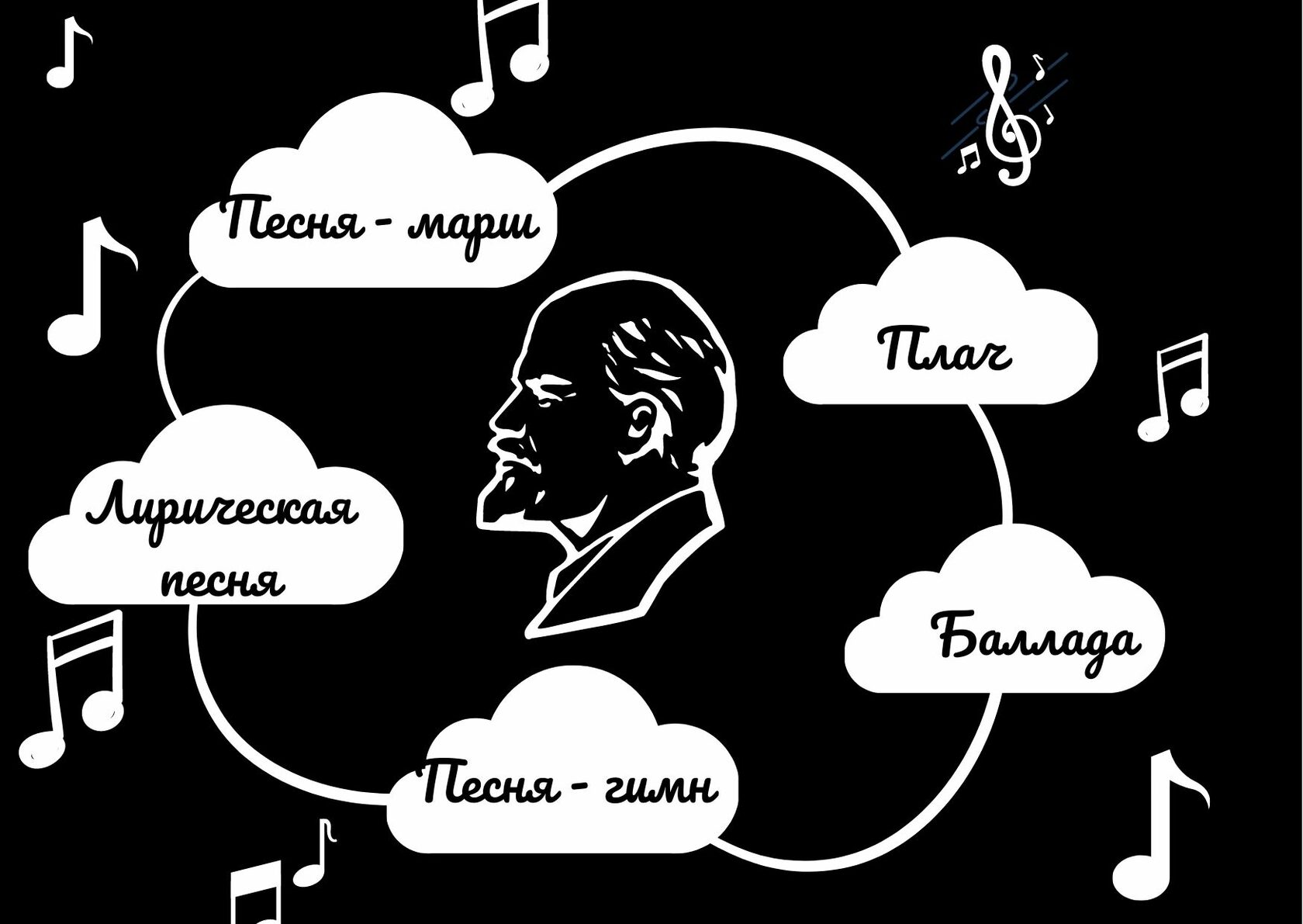 О Ленине созданы песни разных жанров: песни-гимны, песни-марши, баллады, лирические песни. Каждый из них имеет свои характерные черты и особенности.